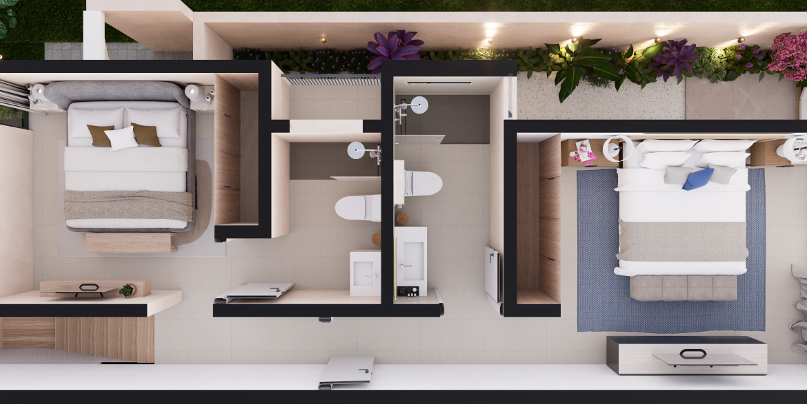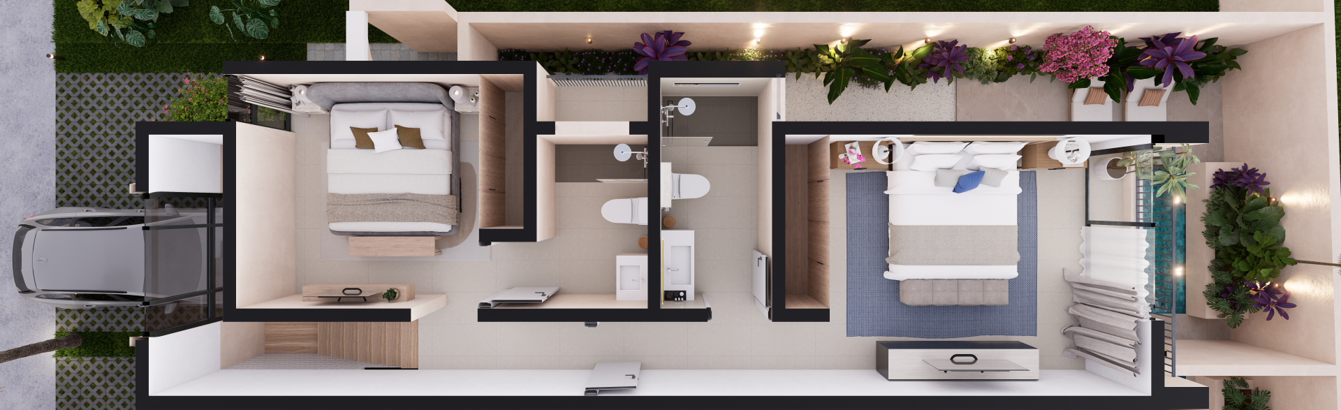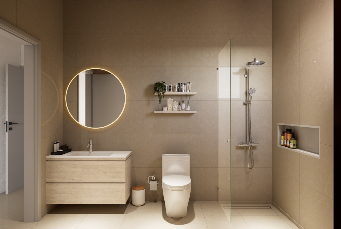 • High-quality finishes: imported porcelain floors, light wood, glass shower screens, sliding windows & doors